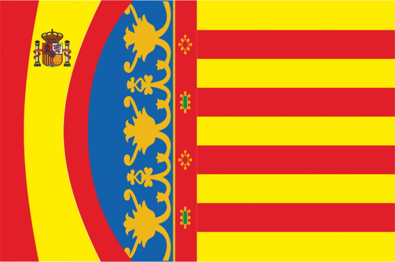 Comprar bandera de recreació autonòmica d'Espanya i València. Bandera realitzada en teixit de polièster de 117 gr. Colors sòlids. Traspàs total del color. Doble costura amb fil especial per a exteriors. Cinta de reforç i anelles de subjecció metàl·liques. Llarga durada a l'exterior. Comprar banderes de qualitat és la millor opció.